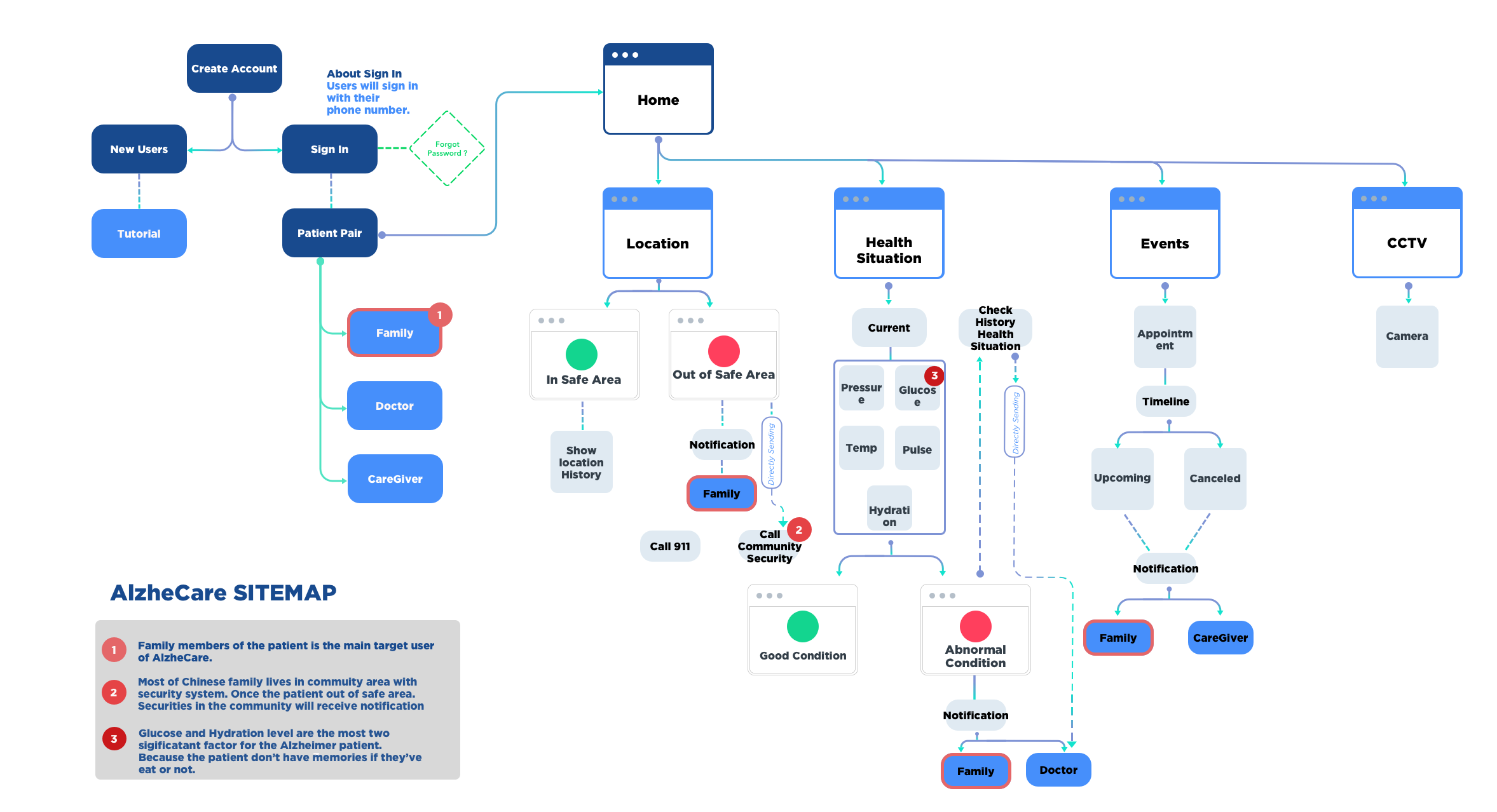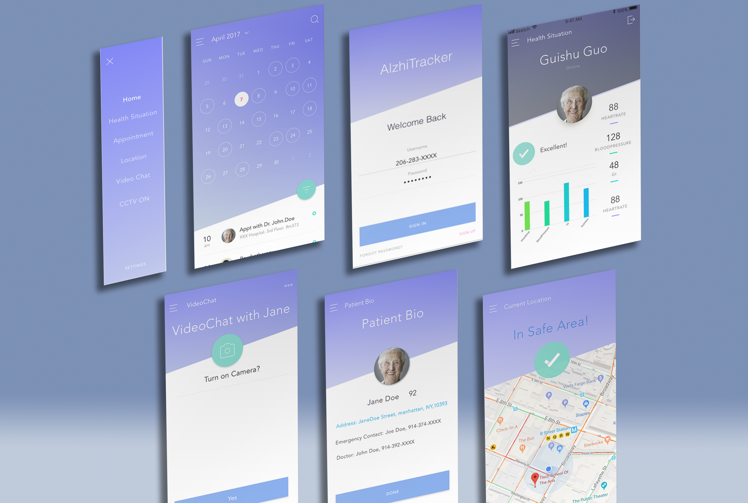 The reason why I design AlzheCare is because my grandmother was an Alzheimer patient. As a family member who was a part of the caring team for five years, I deeply understand that take care of Alzheimer patient is a very hard task, there are no mature and professional system for how to take care of an Alzheimer patient. In order to design a good user experience of AlzheCare, I’ve interviewed my families ( five members), my grandma’s doctor and her caregiver about their experience of taking care of her especially at her last stage. I found the problems and concerns of take care process for an Alzheimer patient.